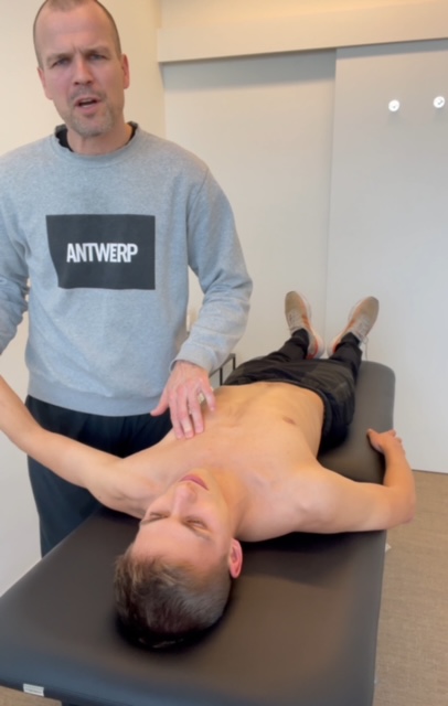 Zijlig waarbij er met de gekruiste hand stevige druk dient uitgeoefend te worden op de spier.